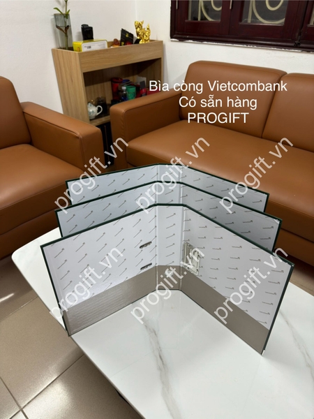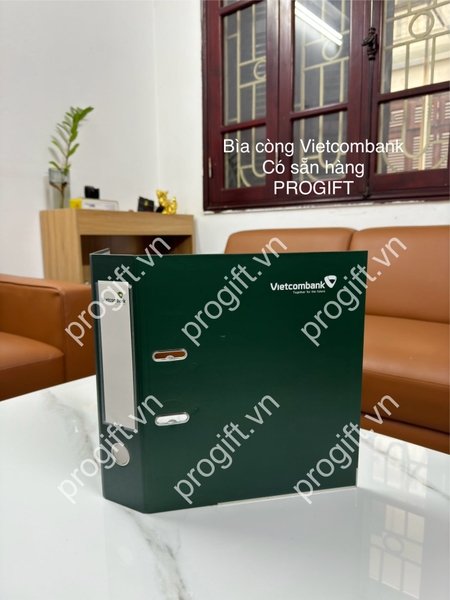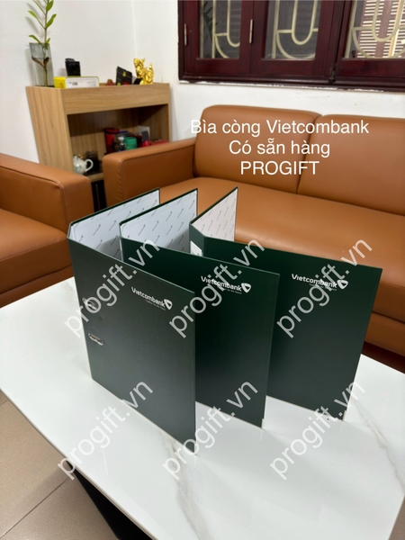 Chất liệu: bìa cứng 2.mm bồi giấy Couche in offset màu và nội dung theo chuẩn nhận diện thương hiệu Vietcombank, đang được sử dụng ở các chi nhánh Vietcombank