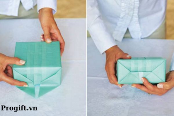 - Bước 3: Tiếp theo, bạn gấp các cạnh còn lại sao cho phần giấy dư được giấu vào trong một cách khéo léo. Cuối cùng bạn cột chặt 2 đầu giấy giữa quà, thắt nơ bằng ruy băng là xong nhé!